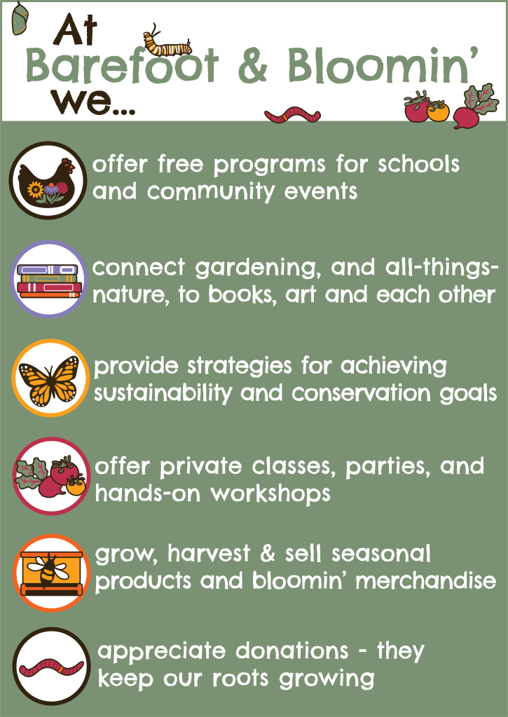 Barefoot & Bloomin’ is a small educational backyard farm and non-profit in Missouri. We spark a love of nature, gardening, reading and the arts, and promote meaningful connections. Everything is connected.